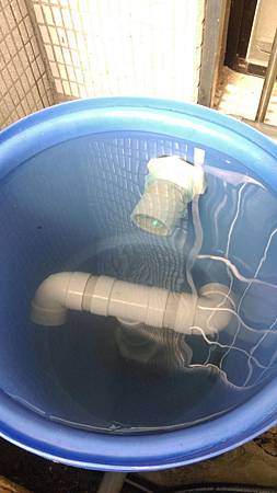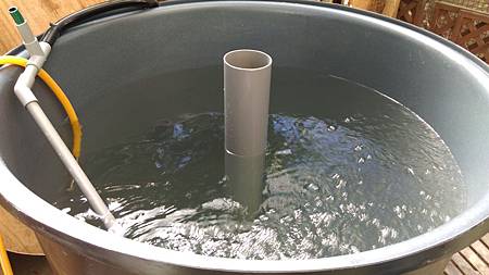 800L魚槽與漩渦沉澱池放置於網室內(目前養加州鱸魚)